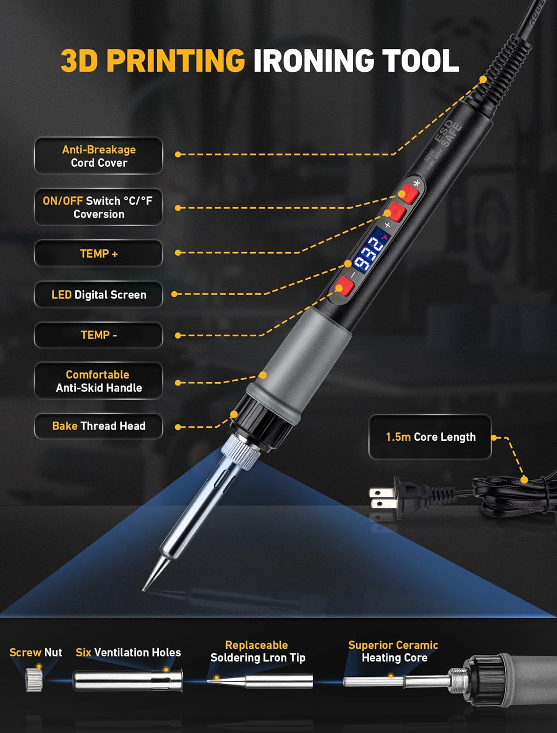 The 80W heating iron is the star of this collection. We tested it on layer lines, support marks, and surface imperfections across dozens of prints. The fast heating capability isn’t marketing fluff—it reaches working temperature in approximately 15-20 seconds. The LCD display provides real-time temperature feedback, which we found invaluable when switching between different materials.