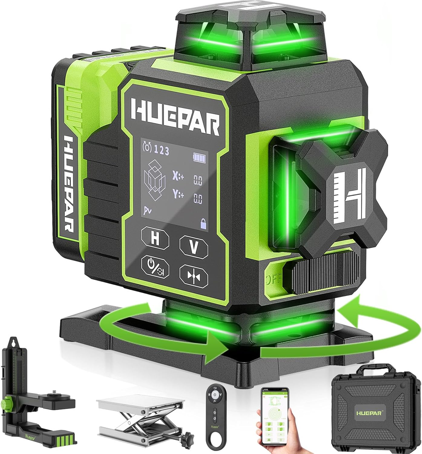 Precision meets power with the Huepar W04CG 360° Laser Level. 4D 16-line green beam, Bluetooth connectivity, and self-leveling technology make professional-grade measurements a breeze for contractors and DIY enthusiasts.