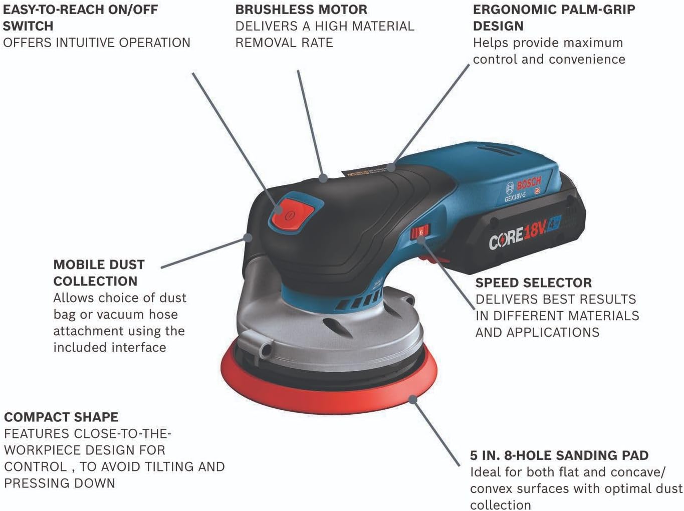 BOSCH 18V 5″ Cordless Orbit Sander Kit with CORE18V 4Ah Battery