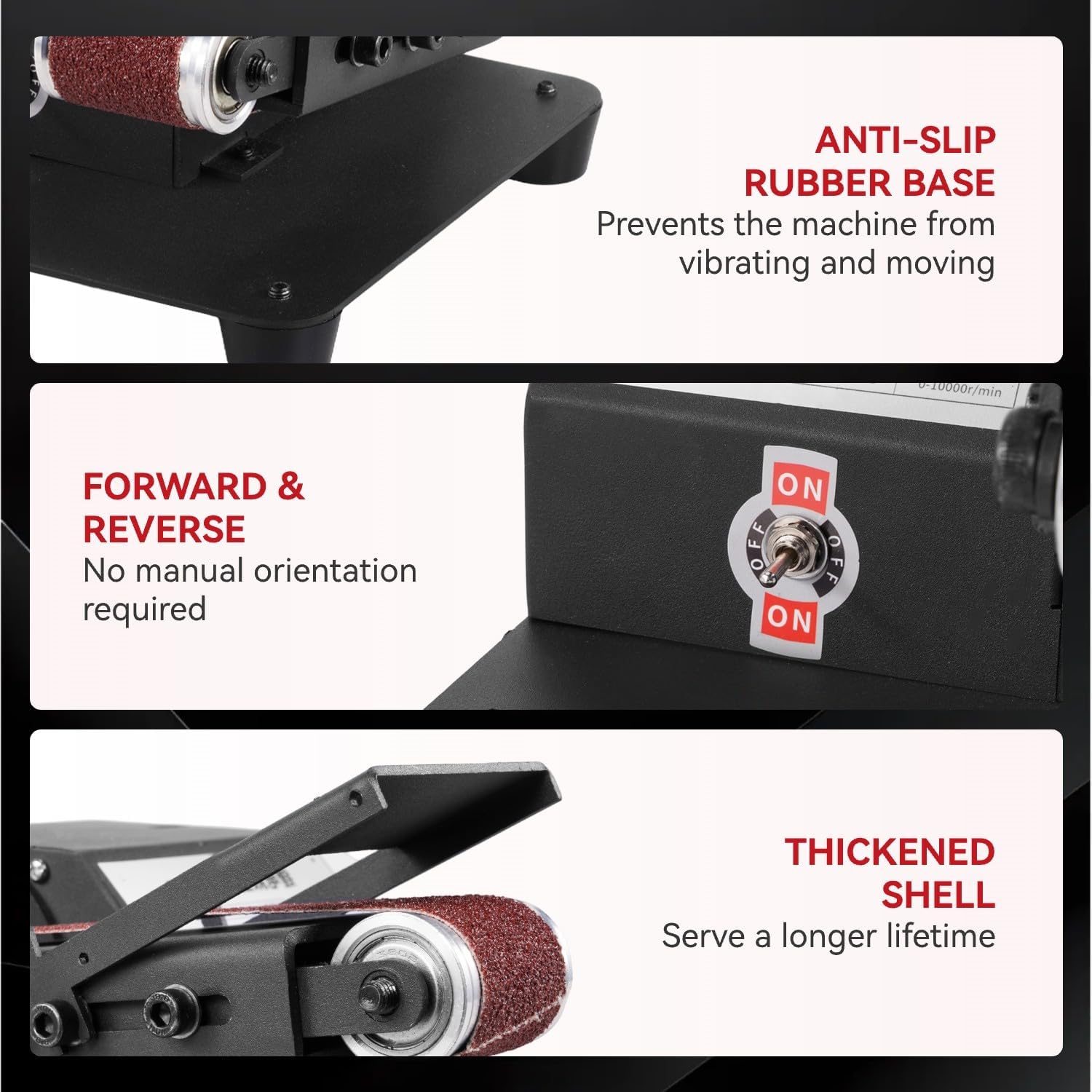 During prolonged use, particularly on metal grinding tasks, we monitored the tool’s heat buildup. The motor housing remained surprisingly cool, suggesting adequate internal ventilation. However, the belt and workpiece do generate significant heat during aggressive material removal—standard for any sanding operation. We recommend working in short bursts on metal to prevent overheating and using water as a coolant when sharpening tools or knives for optimal results.