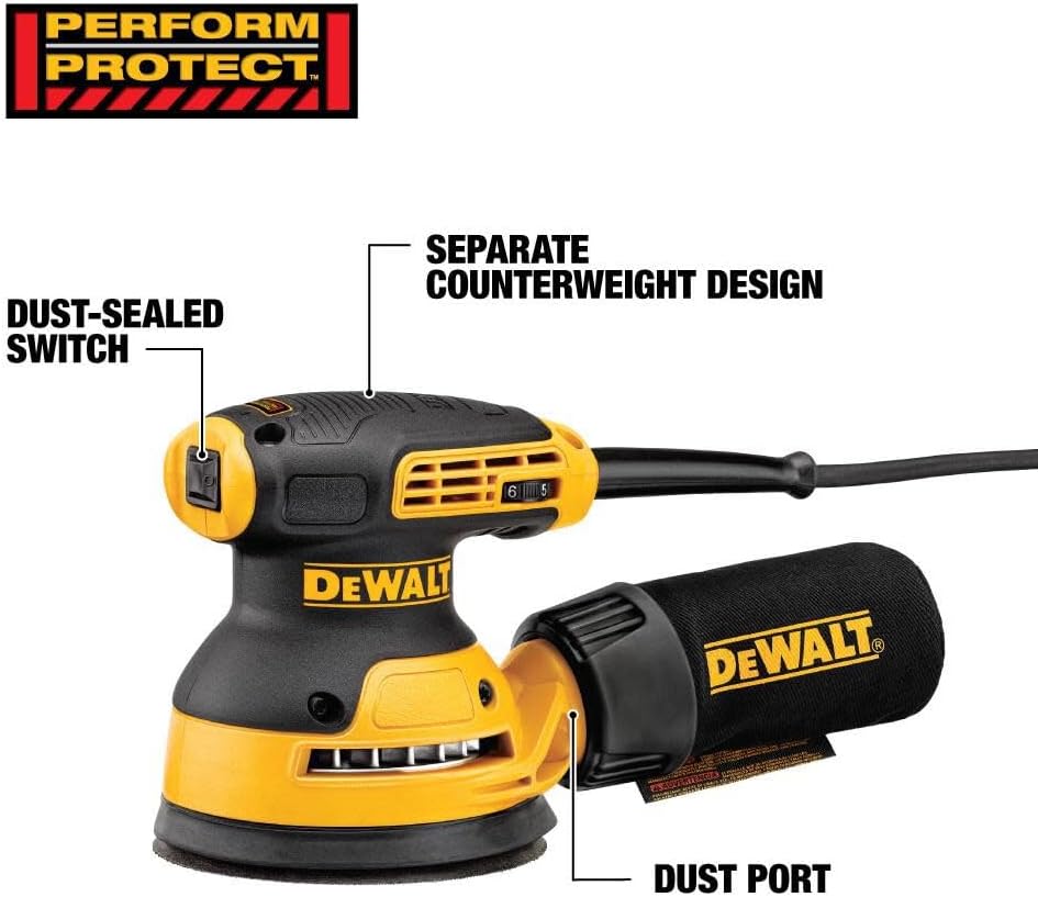 Precision meets power with the DEWALT 5-Inch Orbital Sander. Variable speed control, dust-sealed switch, and comfortable grip make smooth, professional-quality sanding effortless for DIY enthusiasts and pros alike.