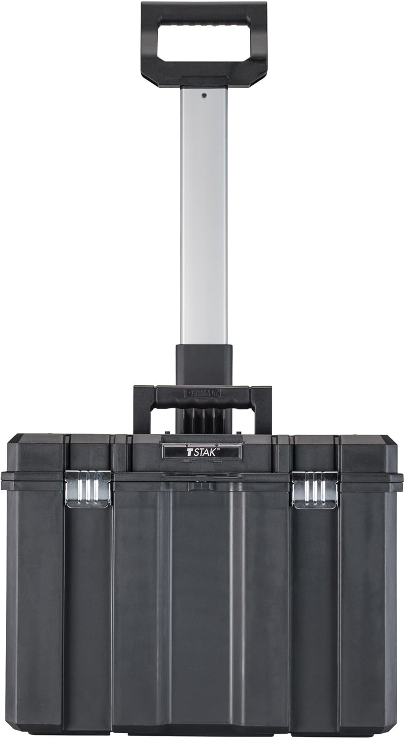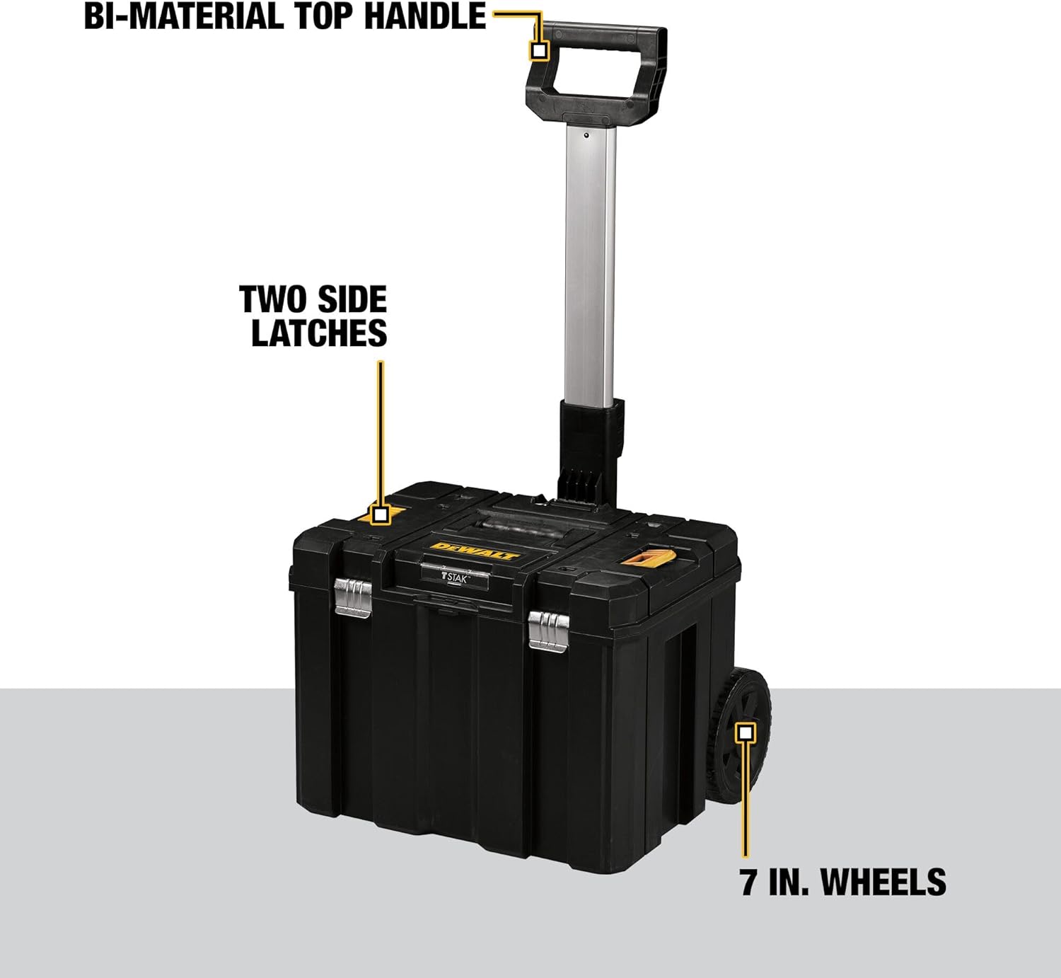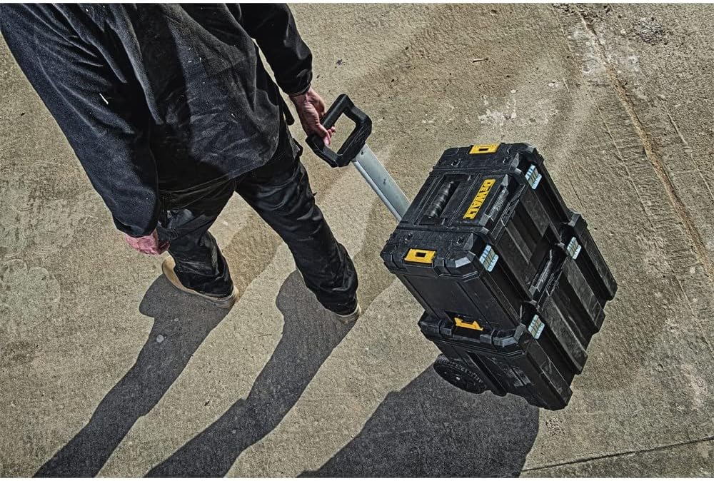 DEWALT TSTAK Rolling Tool Box: modular stackable storage with telescopic handle and rugged wheels for easy transport. Deep capacity keeps tools organized and portable on any jobsite.