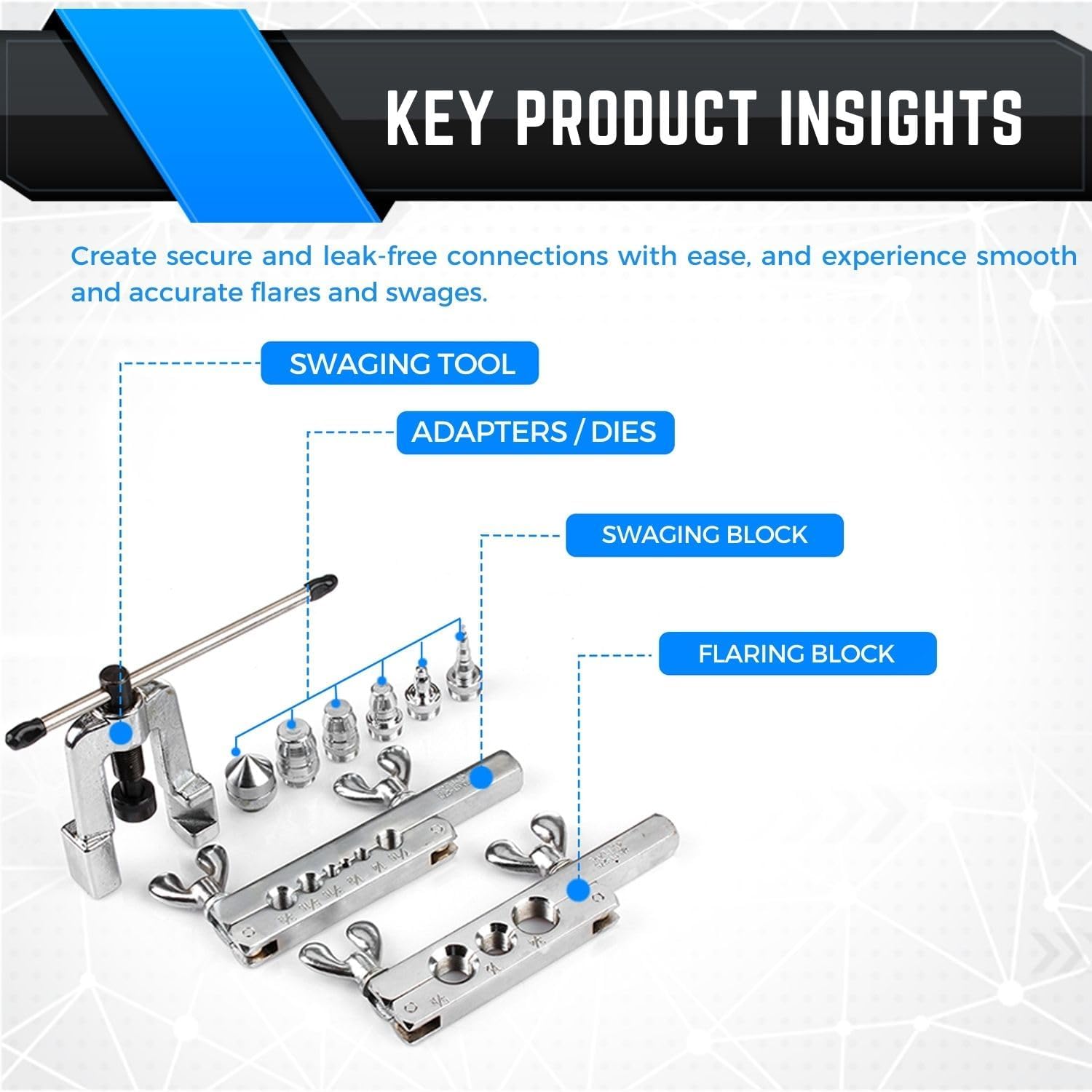 - 14-Piece Set Includes: Flaring yoke, flaring cone, seven adapter blocks, four swaging punches (1/4″, 5/16″, 3/8″, 1/2″), and carrying case