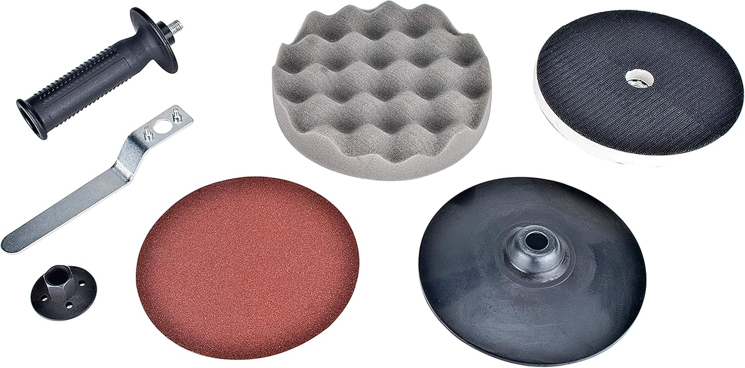 • Includes multiple accessories: Foam polishing pad, hook and loop backer pad, sanding disc, and rubber backing pad