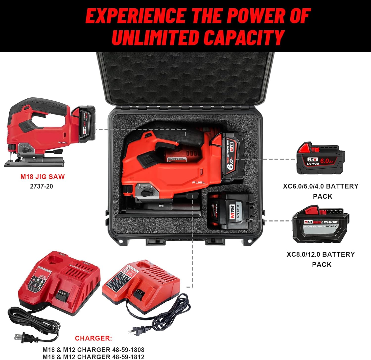 Protect your Milwaukee M18 Fuel jigsaw with this durable hard case. Custom-fit design securely stores your 2737-20 D-handle jigsaw, batteries, and charger. Built tough for safe transport and organized storage.