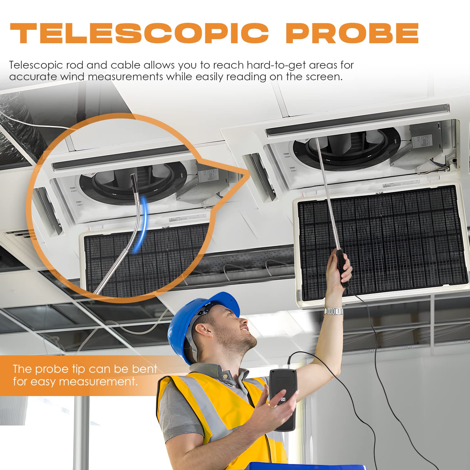 Professional thermal anemometer measuring air velocity, temperature & flow with backlit LCD. Perfect for HVAC technicians testing duct airflow. Handheld design for easy in-duct measurements.