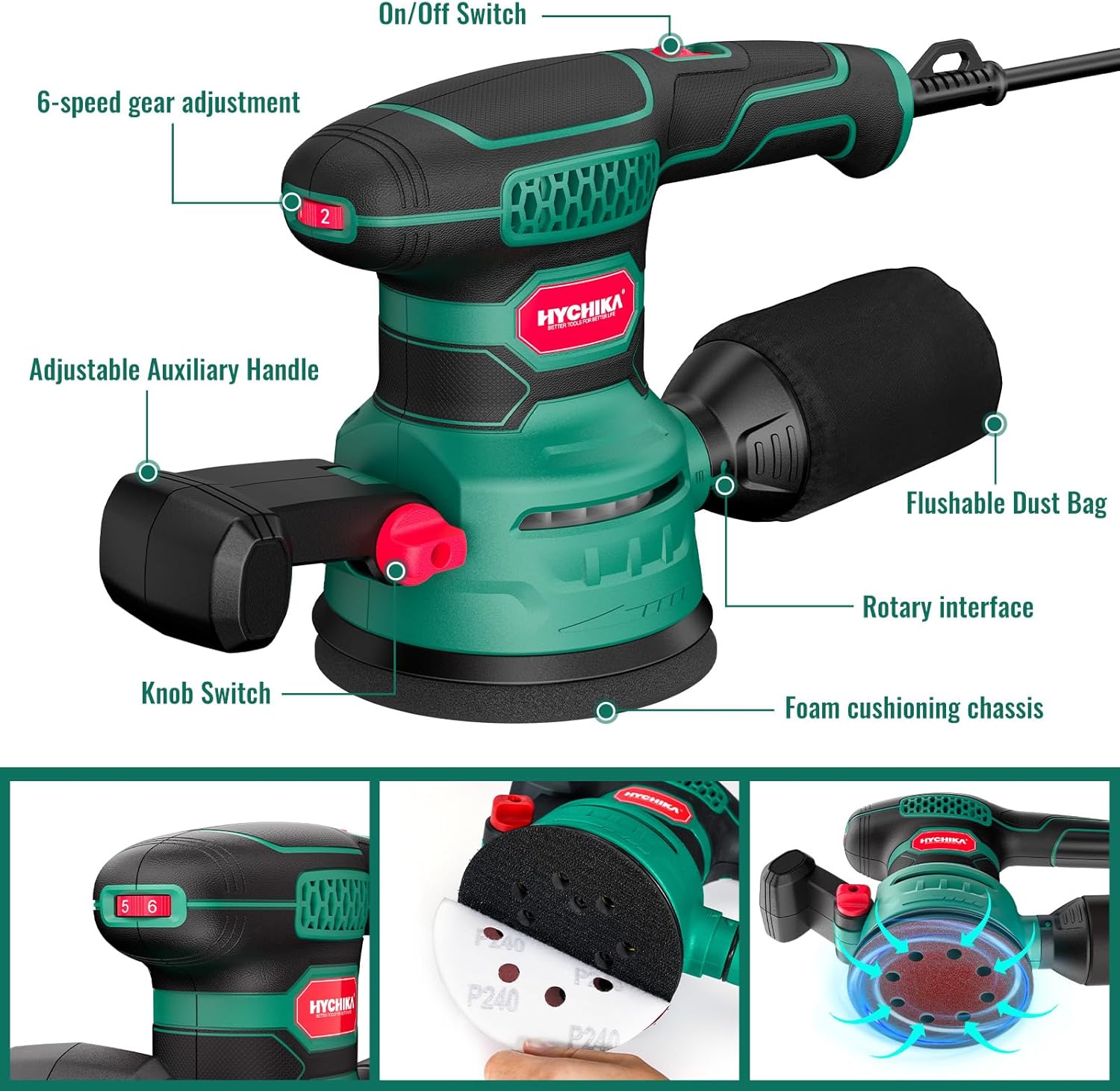 HYCHIKA 6-Speed Random Orbit Sander 3.8Amp 5″ Electric Woodworking Tool