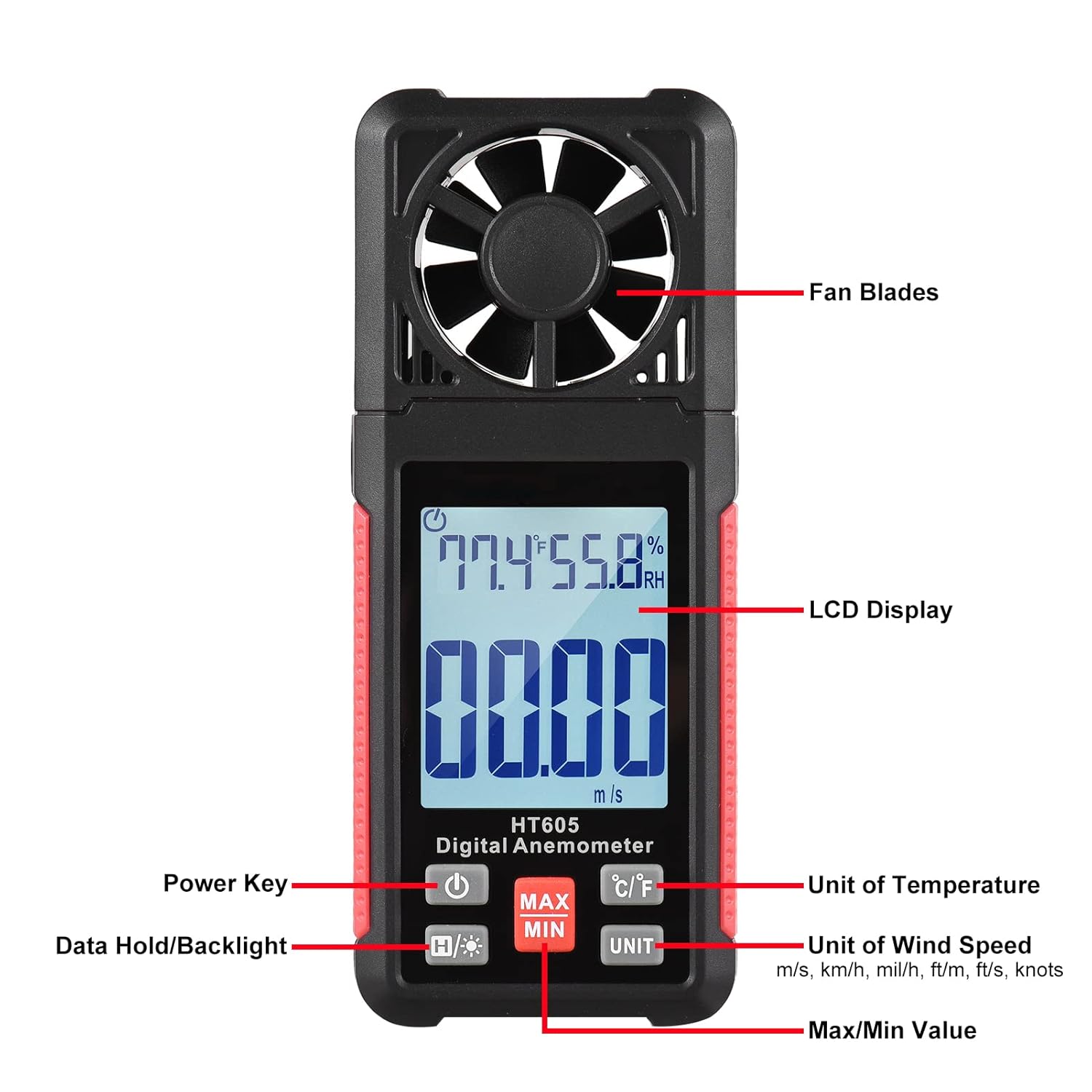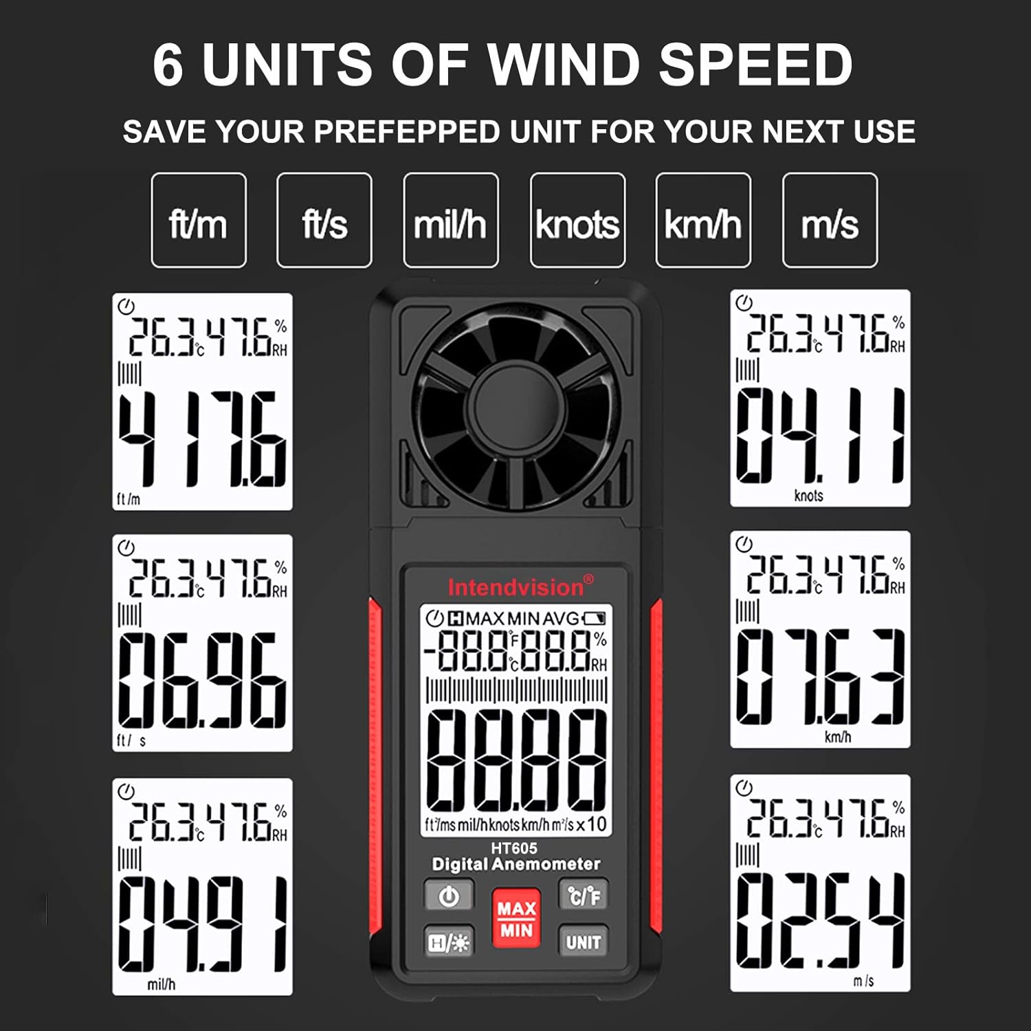 – Wind speed measurement in five different units (m/s, km/h, ft/min, knots, mph)