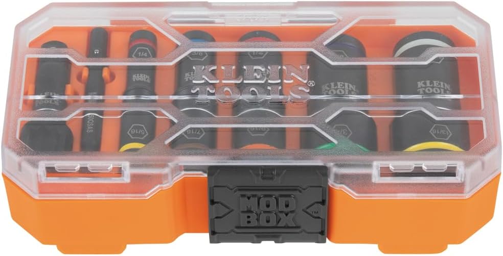 Klein Tools KNECT Flip-10 SAE Impact Socket Set delivers versatility with 10 color-coded deep sockets in one compact MODbox. Includes 1/4″ and 3/8″ adapters and innovative flip socket design for quick size changes, making any job more efficient.