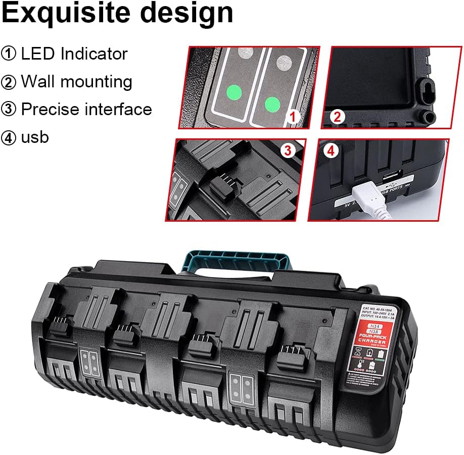 - Four simultaneous rapid charging ports: Each port delivers independent charging current, so all four batteries charge at full speed simultaneously—no power sharing or cycling between ports.