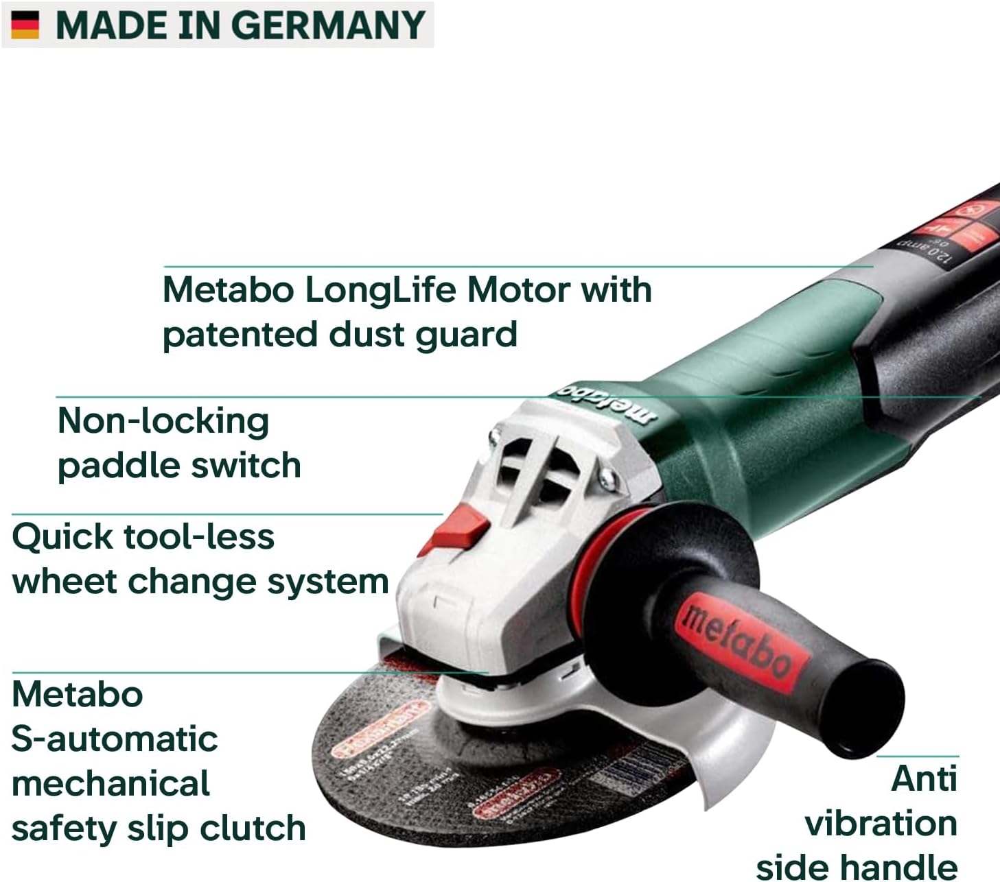 Precision German engineering meets powerful performance. This 12 Amp Metabo angle grinder delivers 10,000 RPM with a quick paddle switch, making metal cutting and grinding effortless and professional-grade.