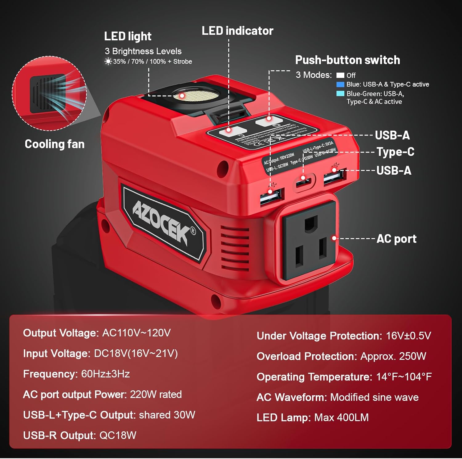 Power up anywhere with the 220W Azocek Inverter: Milwaukee 18V battery compatible, 110V AC outlet, dual USB ports, and Type-C charging. Bonus 400LM LED work light for ultimate portable power and convenience.