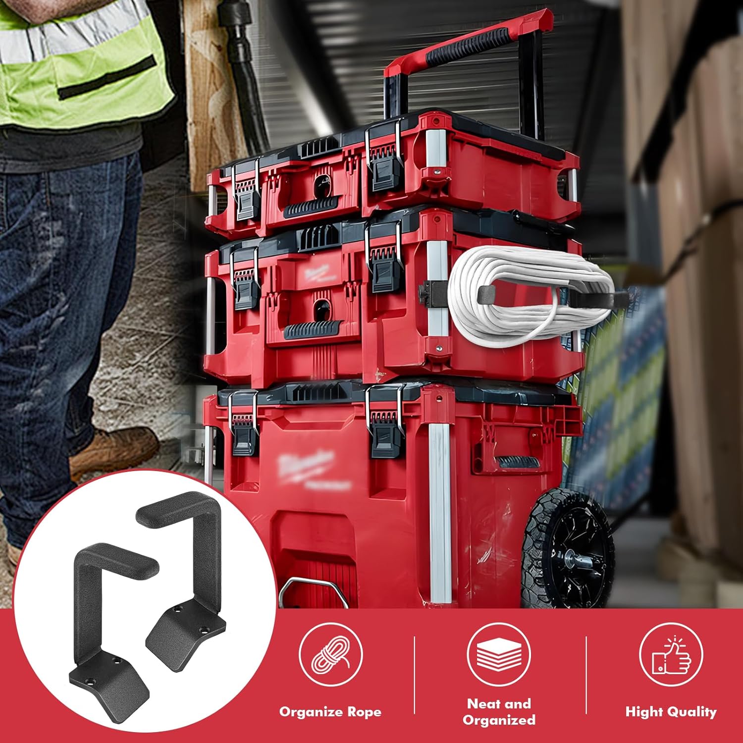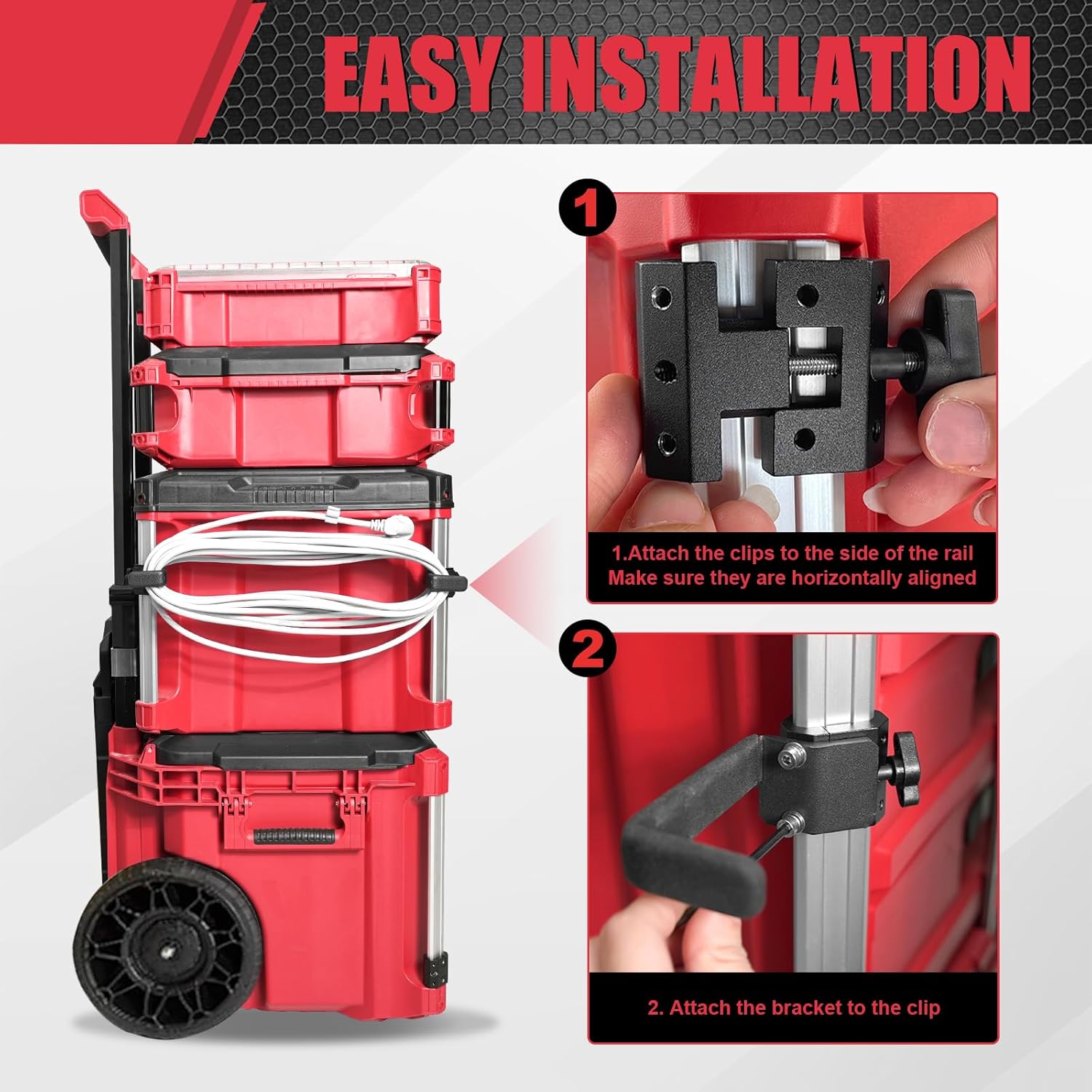 Maximize your Milwaukee Packout organization with this smart cord holder. Secure extension cords neatly, prevent tangling, and optimize toolbox storage with durable corner rail clips. Easy installation, professional workshop solution.