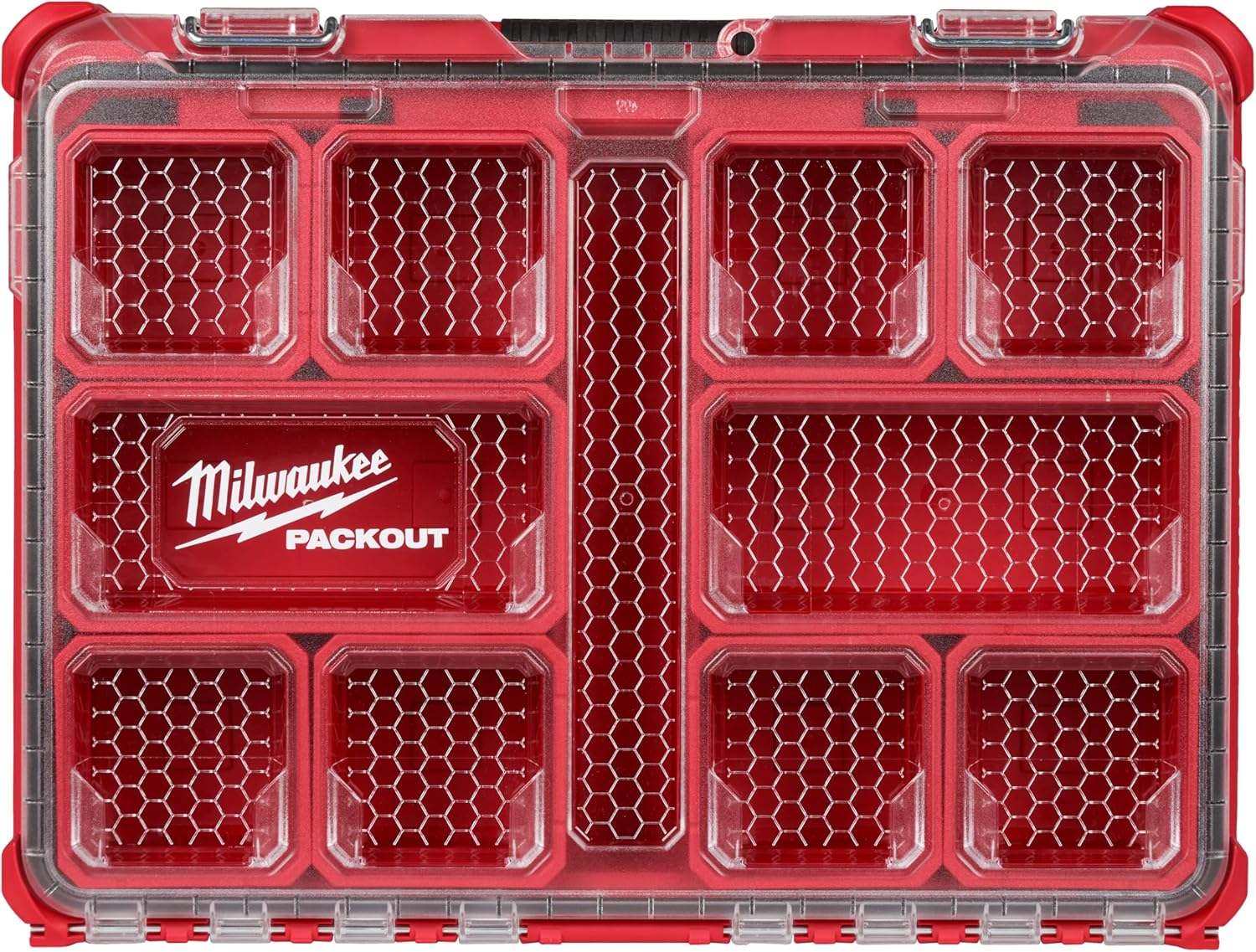 Maximize workspace efficiency with Milwaukee’s 10-compartment Packout Organizer. Durable, customizable storage solution with clear lids for quick part identification and secure, stackable design for professional tool management.