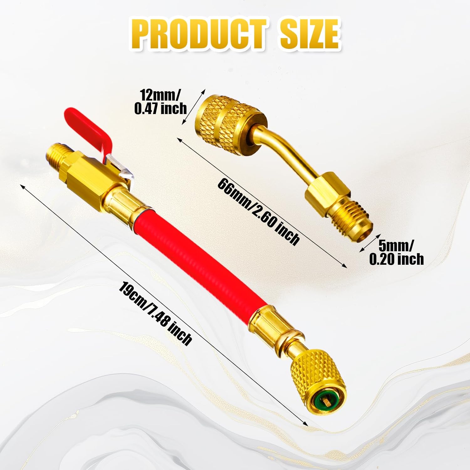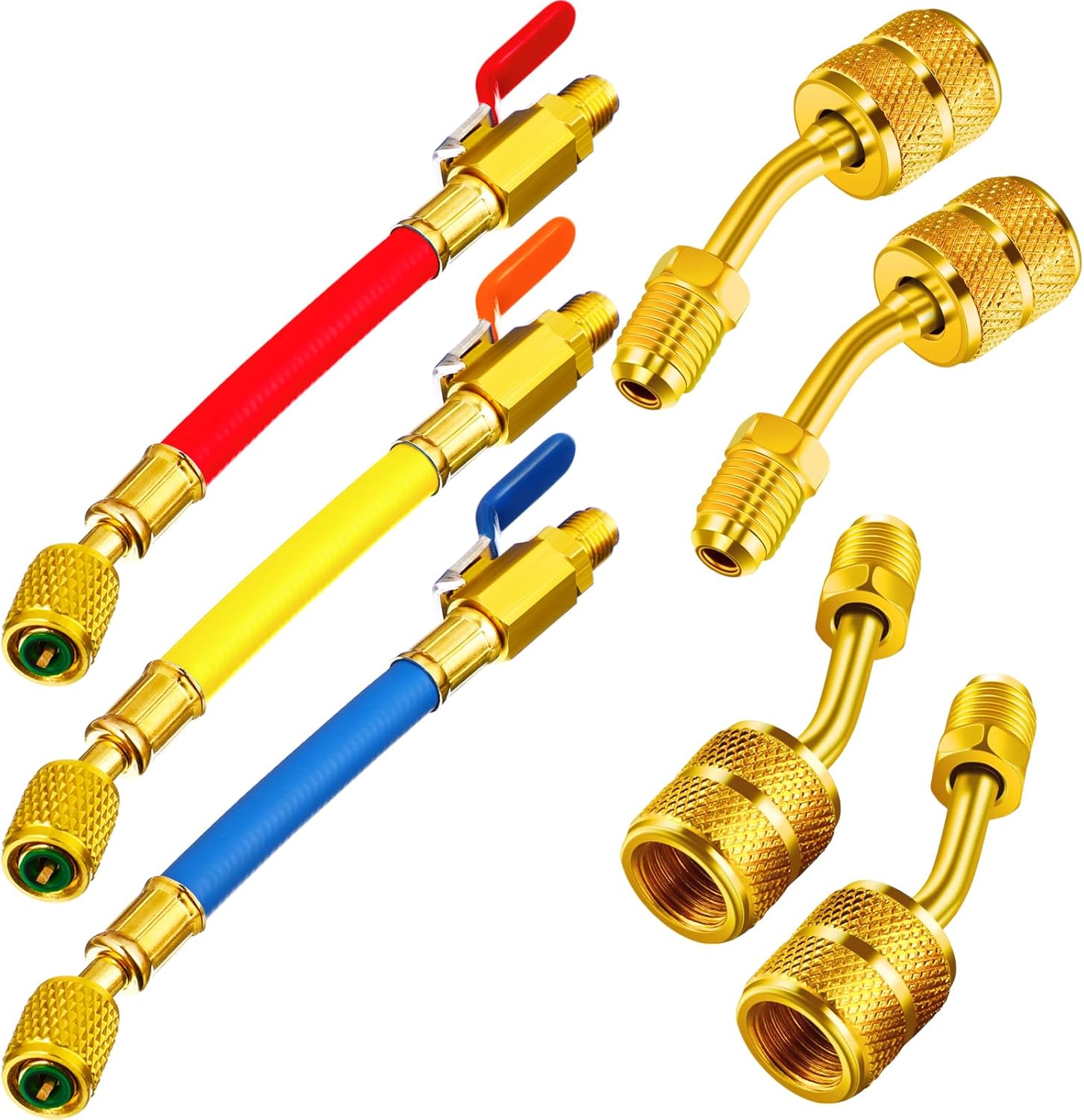 Complete HVAC solution! 7-piece set includes 3 ball valves & 4 angle adapters. Compatible with R410A, R134A, R12, R22. Durable 1/4″ compact design for efficient refrigerant control and system maintenance.