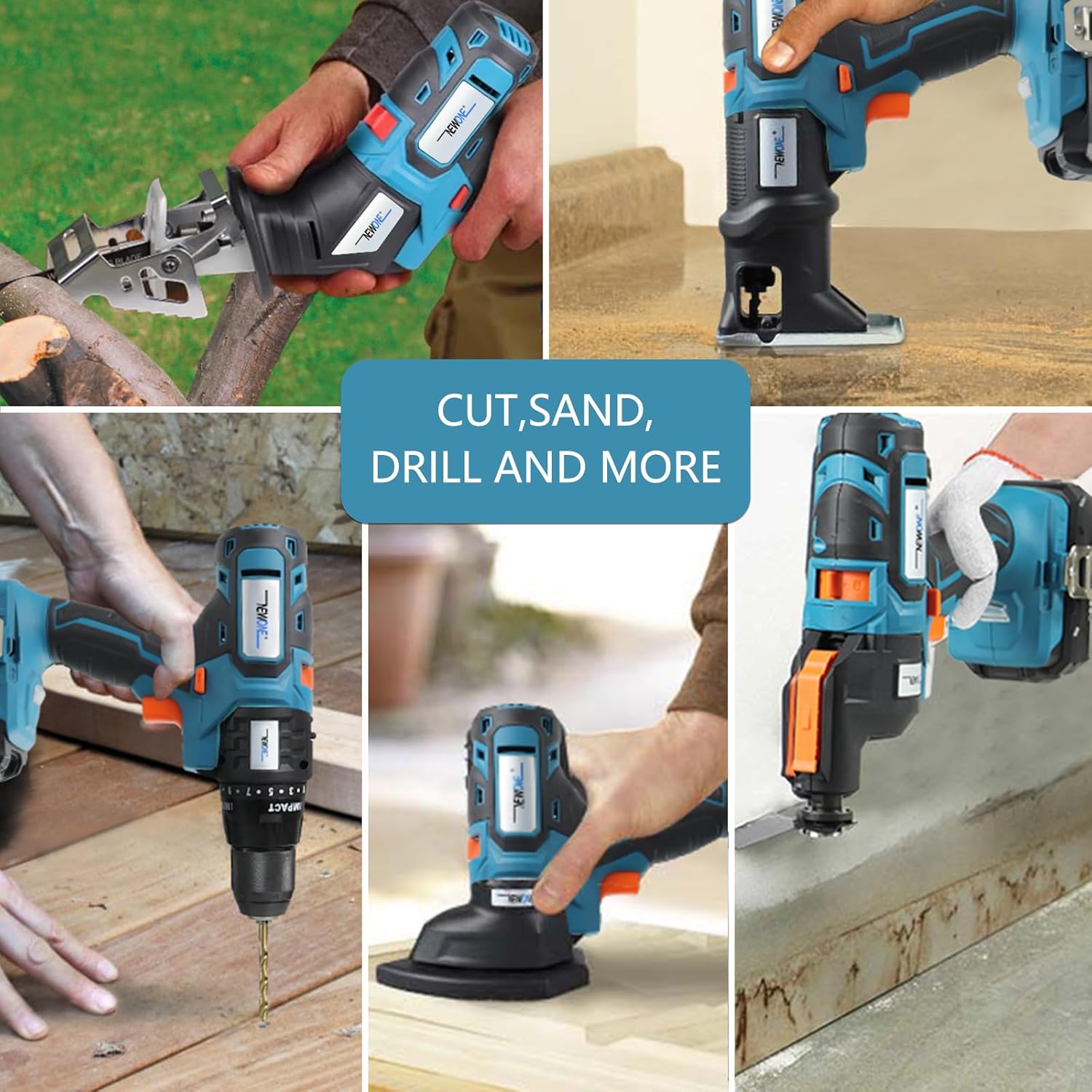 Complete 5-tool power system compatible with Maki-ta 18V batteries. Includes drill, reciprocating saw, impact driver, oscillating tool, and sander. Comes with 2.0Ah battery, charger, and accessories for any DIY or professional job.