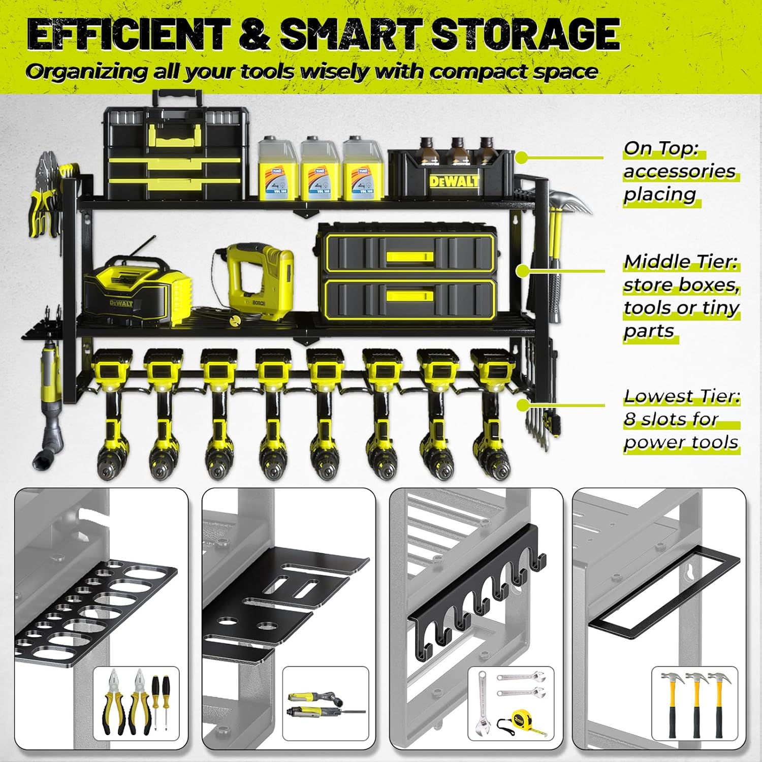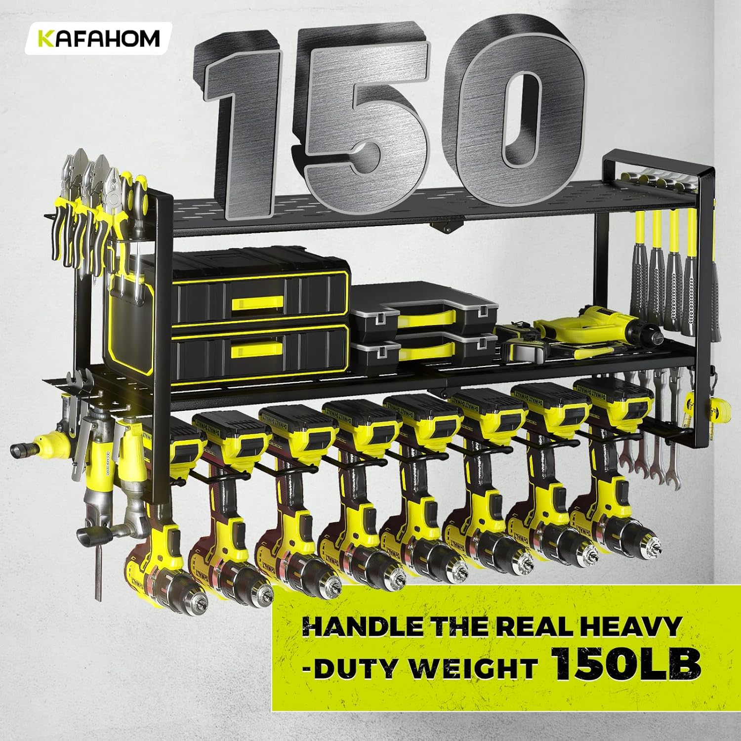 KAFAHOM Power Tool Organizer – Heavy-duty metal wall mount holds 8 drills plus air tools, screwdrivers & hammers. Transform your garage with professional-grade storage that keeps tools accessible & organized.