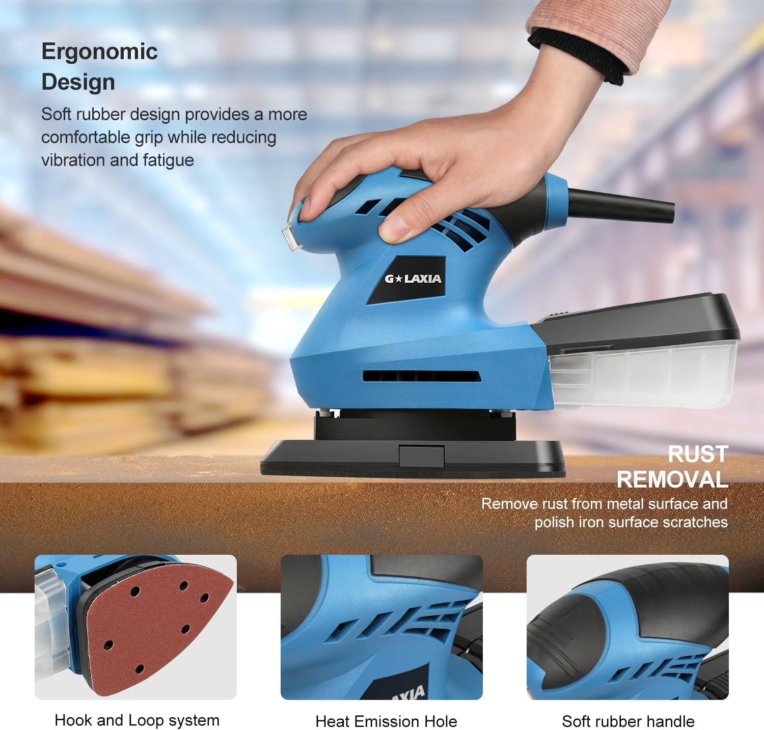 The ergonomic design fits comfortably in your hand, reducing fatigue during extended use. The compact form factor allows you to access tight corners and intricate areas that traditional sanders simply can’t reach.