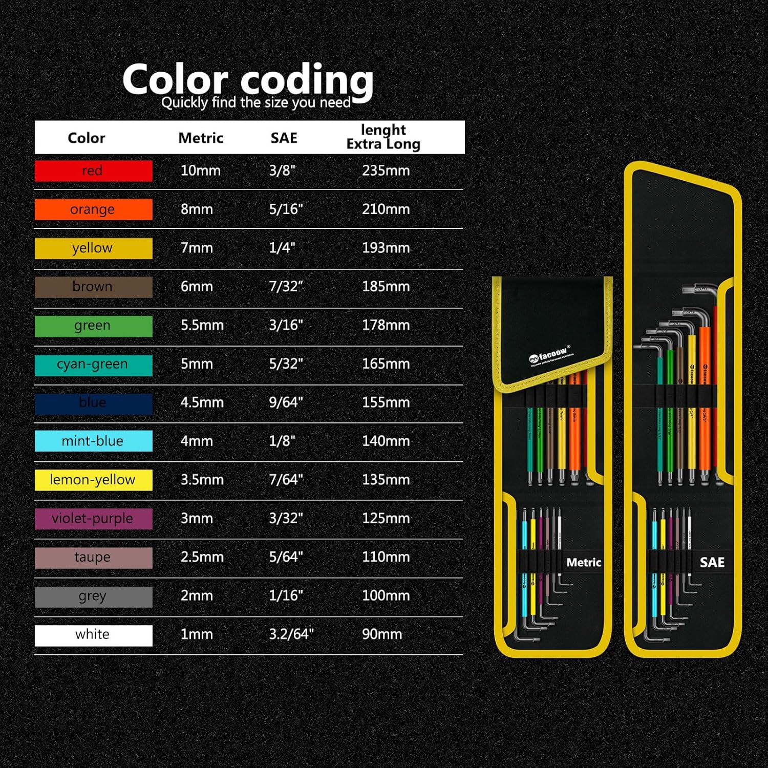 – Metric sizes: 1.5mm, 2mm, 2.5mm, 3mm, 4mm, 5mm, 5.5mm, 6mm, 7mm, 8mm, 9mm, 10mm