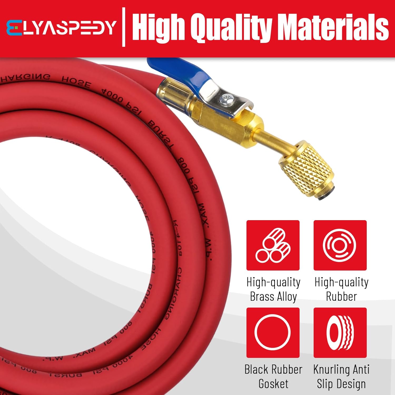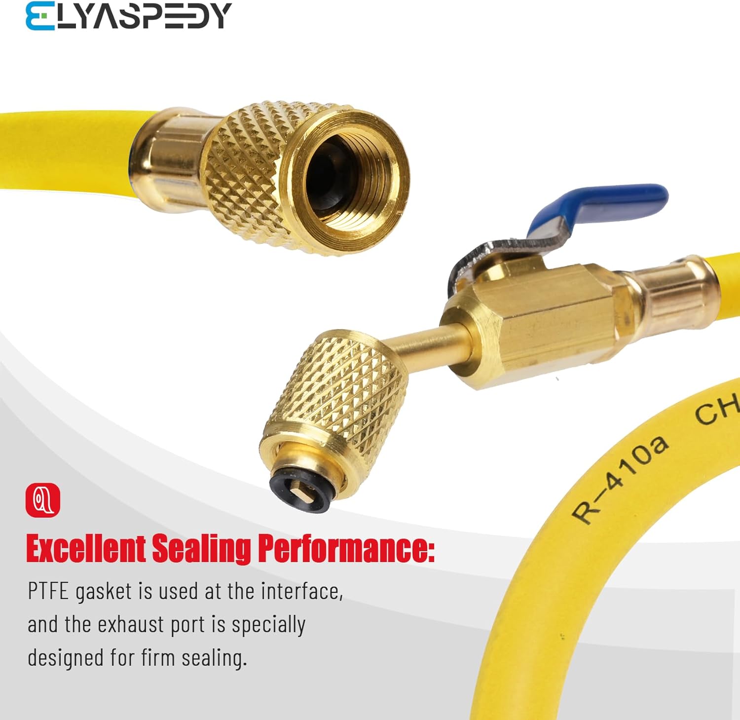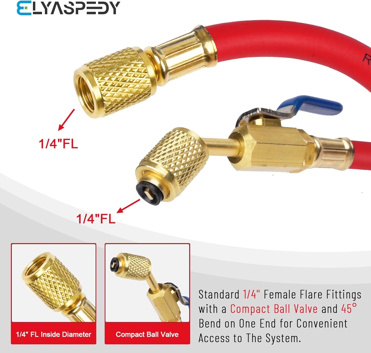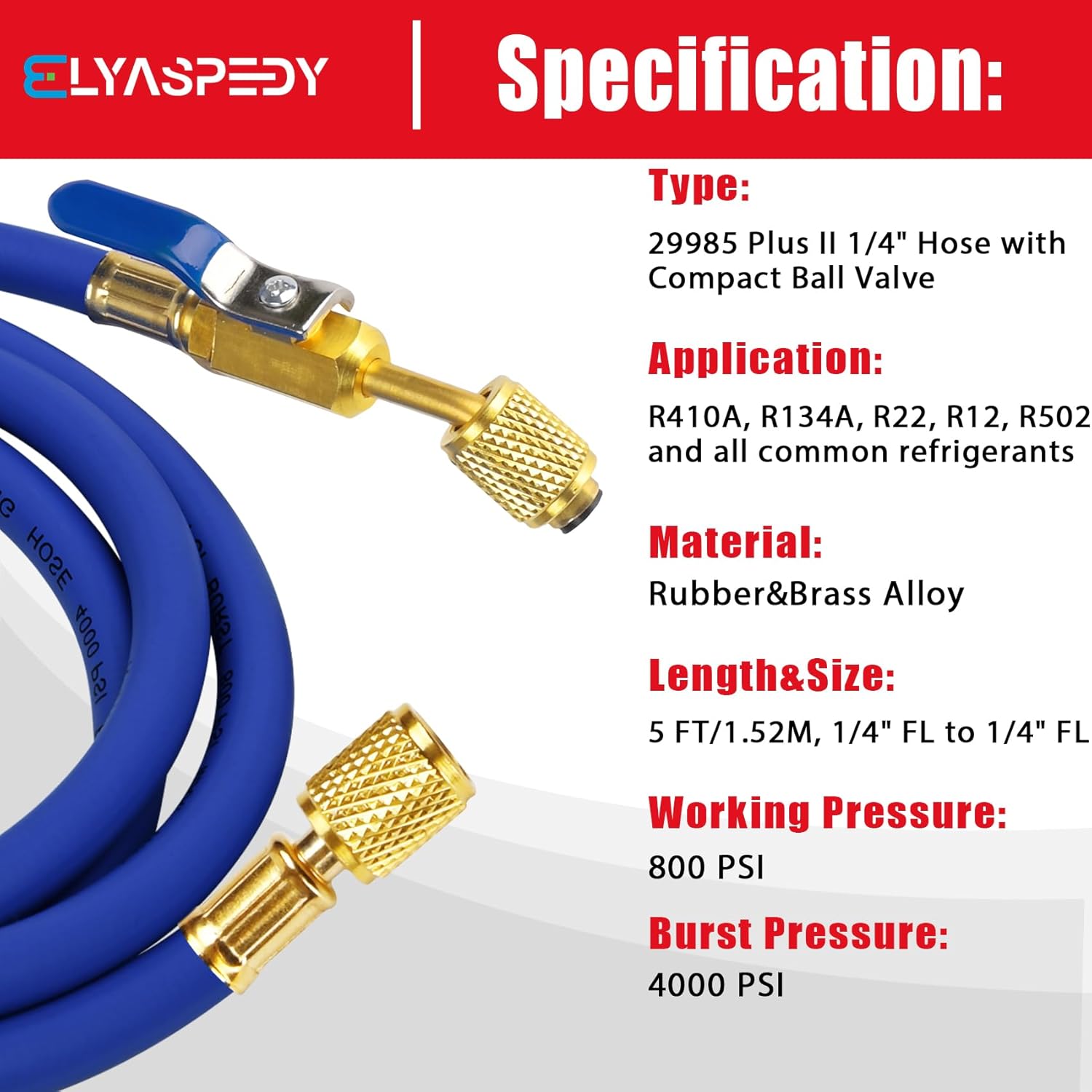 Premium HVAC Hoses with ball valves for precise control. Compatible with R410A and common refrigerants. Durable 800 PSI working pressure in 60″ length. Color-coded set includes red, yellow, and blue hoses with standard 1/4″ flare fittings.