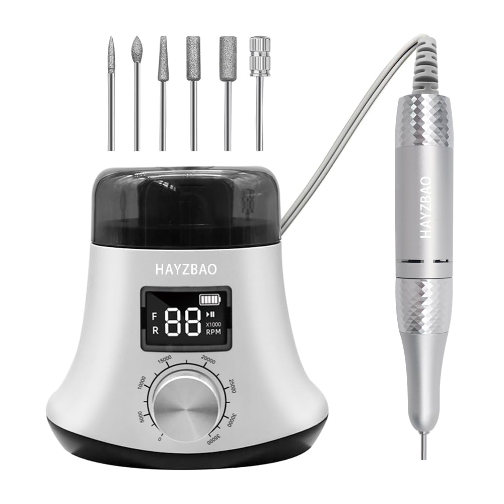 The HayZBao 35000 RPM Professional Electric Nail Drillis a decent corded e-file with a few design inconveniences.The good⢠large range of speeds – especially since I mainly use an e-file for cuticle and callus work I need low speeds so as not to hurt myself⢠low noise and vibration⢠reasonable torque at higher speedsNot so good⢠need a table top to set the base on, so it’s not as portable as it could be⢠doesn’t turn off after even two hours of inactivity, even when the e-file is not connected to the base, so I think it might be possible to accidentally power up the base and leave it powered up.⢠the collar that opens and closes the chuck is textured, but not quite enough – at one point I thought the chuck was stuck in the closed position, but I just didn’t have a good enough grip to turn the collar. A scrap of an old dishwashing glove would help.⢠Directions that need to be read with a magnifying glass should be posted on the product page. While it’s not that hard to remember how many presses turn turn on/off, pause and reverse directions, a toggle switch for these functions would have been more straightforward, especially because the way the electronics interpret clicks is a bit funky.ºº If you are paused, a double click switches from F to R and the device stays paused until you single click to restartºº If you want to switch rapidly from F to R, your double click has to be very fast (and even if you think you’ve mastered the clicking technique, it can be somewhat hit-or-miss) or the machine interprets your clicks as pause and restart so “nothing happens”⢠I tested only the needle bit of the included starter bit set and it is definitely not spectacular. A good set of bits is not expensive and makes a huge difference.⢠the biggie at the time of this review: price! An identical model from a different Amazon vendor is currently selling for half its price (and the other vendor even includes a couple more bits).
