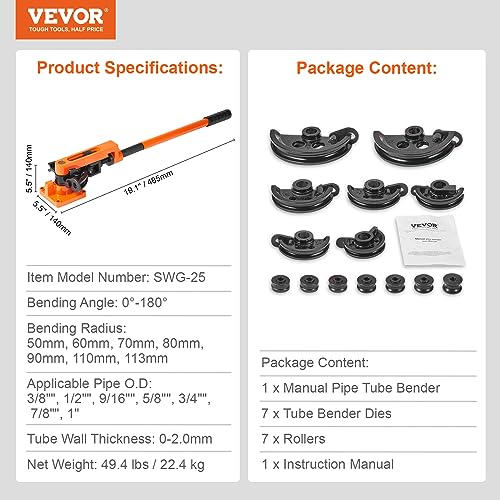 Precision meets power with the VEVOR Pipe Tube Bender. 7 dies, 180° range, perfect for HVAC, auto repair & more. Bend copper, aluminum pipes from 3/8″ to 1″ with professional-grade accuracy and ease.