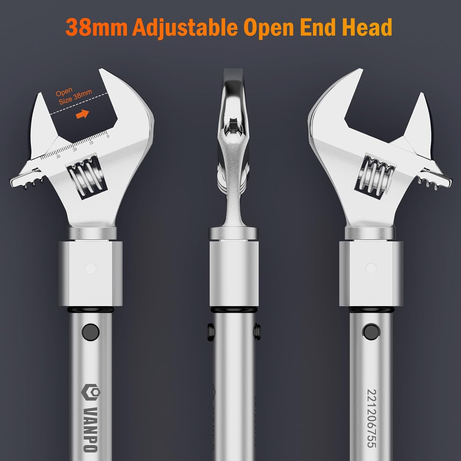 – **Interchangeable Heads**: Includes both 1/2″ drive ratchet and 38mm open-end attachments