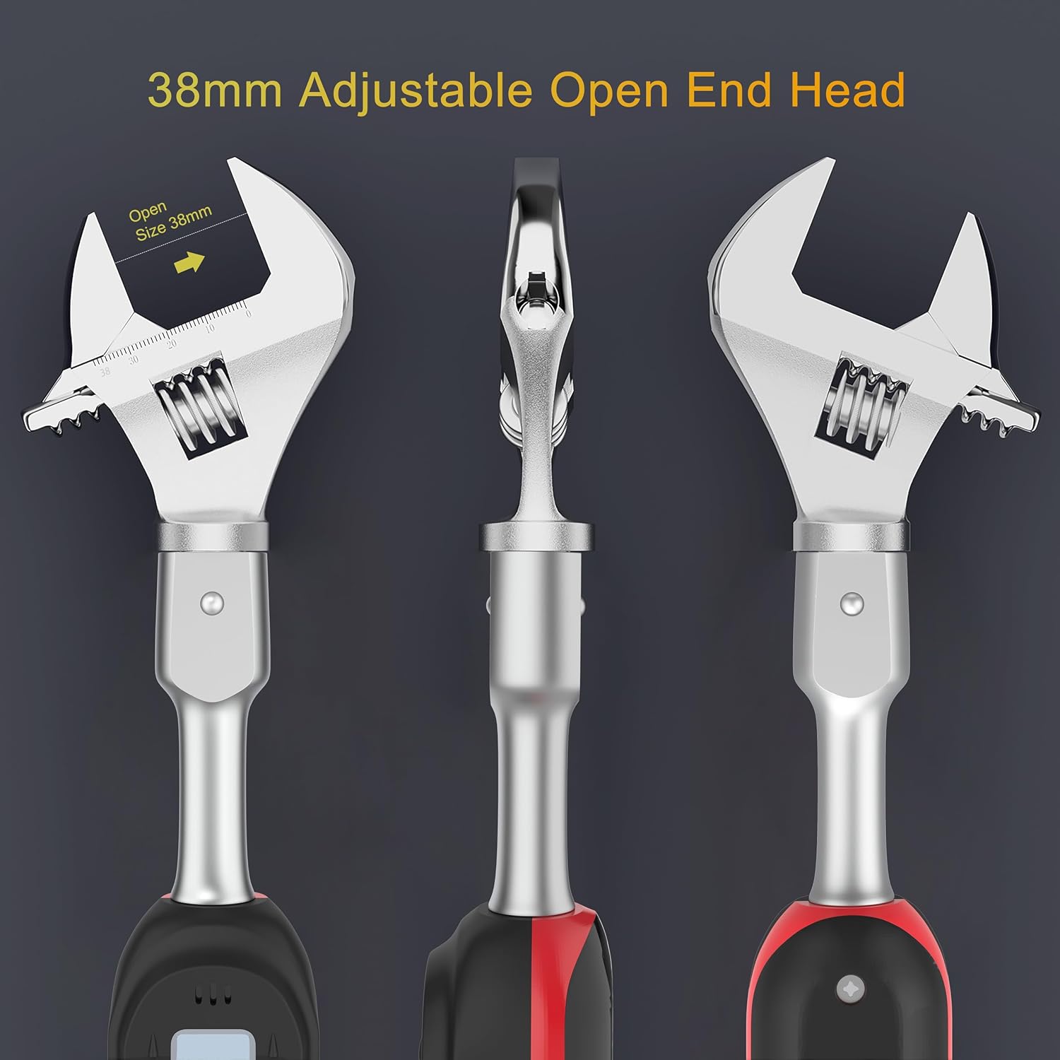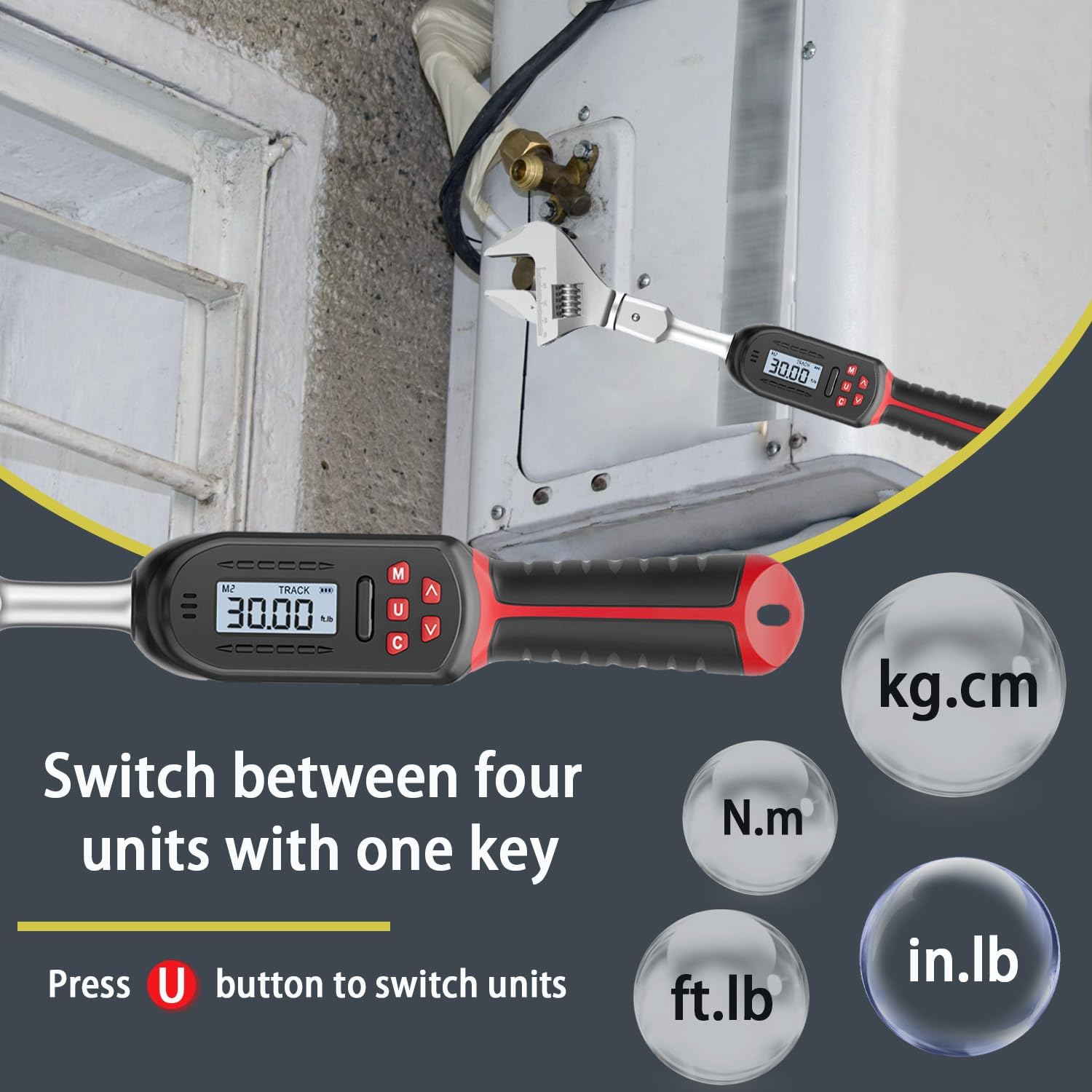 Precision HVAC torque wrench with LED and buzzer alerts. Accurate to 2%, ranges 2.2-44.2 ft.lb, perfect for mini-split AC and pipeline installations. 9×12 mm open end, adjustable 38 mm jaw for reliable, professional-grade performance.