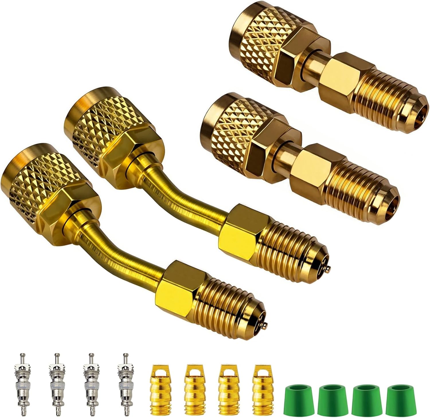 The kit includes two straight adapters and two angled adapters, giving you maximum flexibility for tight spaces and awkward angles. During our testing on cramped rooftop units and basement installations, the 90-degree angled adapters were absolute lifesavers. We could access service ports that would have been nearly impossible to reach with straight connections alone.