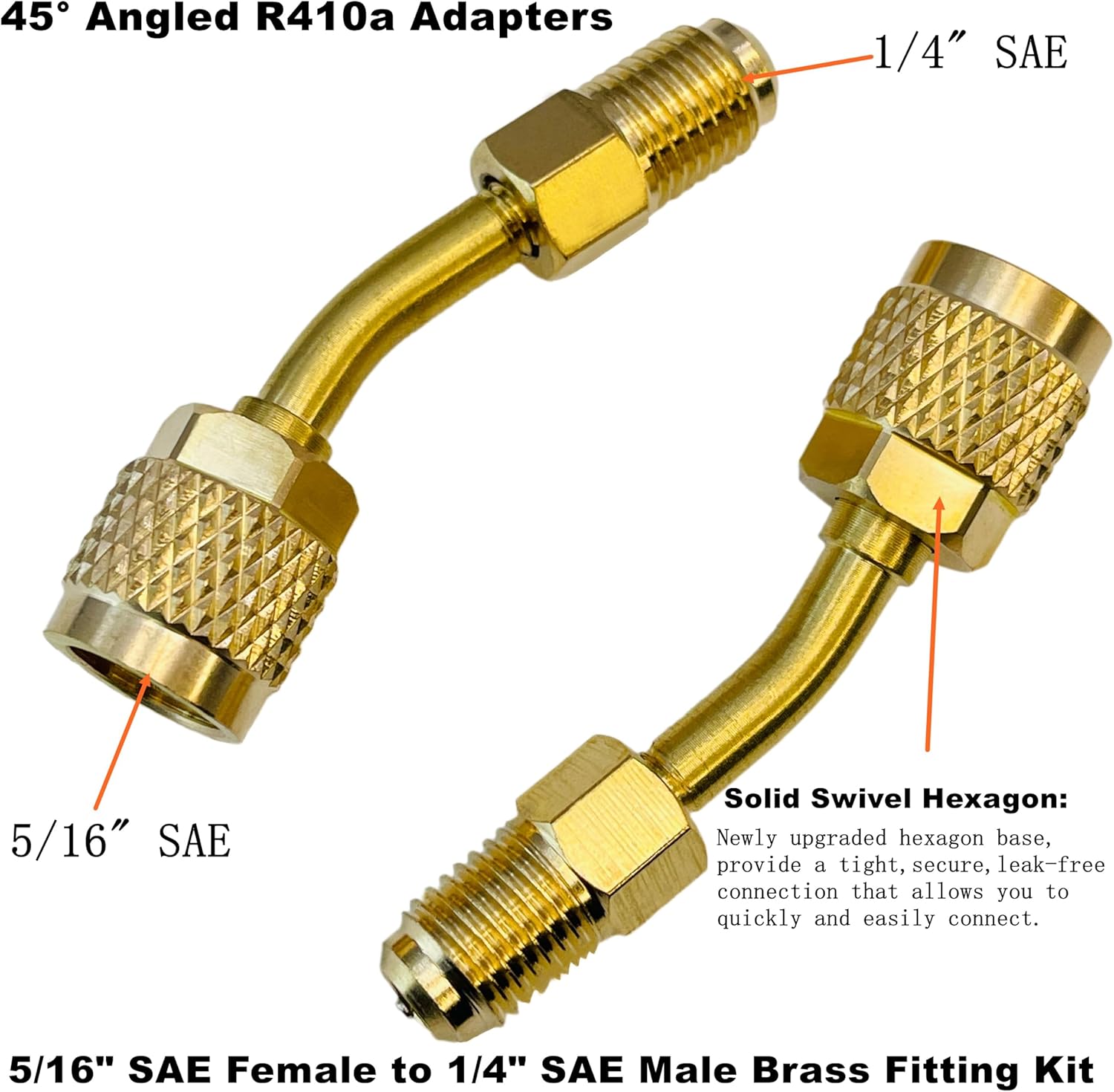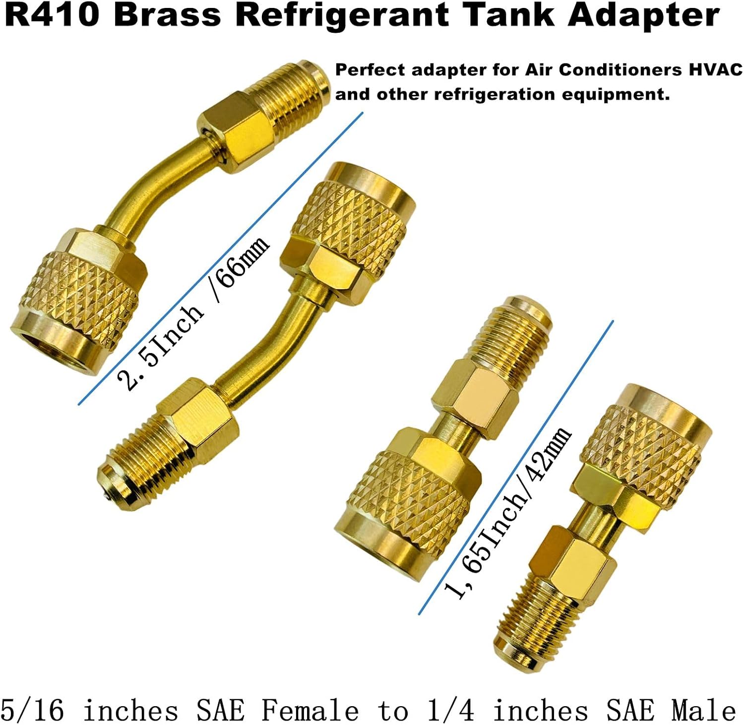 Complete R410a adapter kit with 4 adapters (2 straight, 2 angled) converts 5/16″ SAE female to 1/4″ SAE male flare. Includes gaskets and valve cores for reliable HVAC and refrigeration connections.