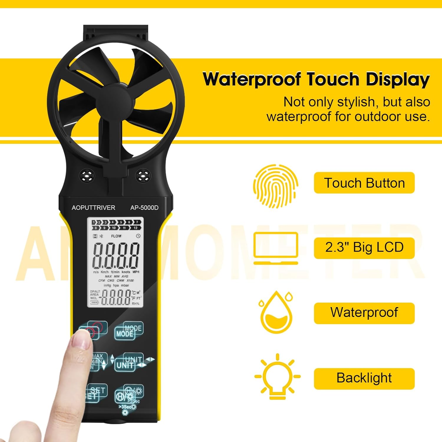 Professional HVAC anemometer with touch screen measures air flow 0-999,900 CFM, temperature monitoring, backlight display, data hold function. Rechargeable design perfect for HVAC vents, sailing, and shooting applications.