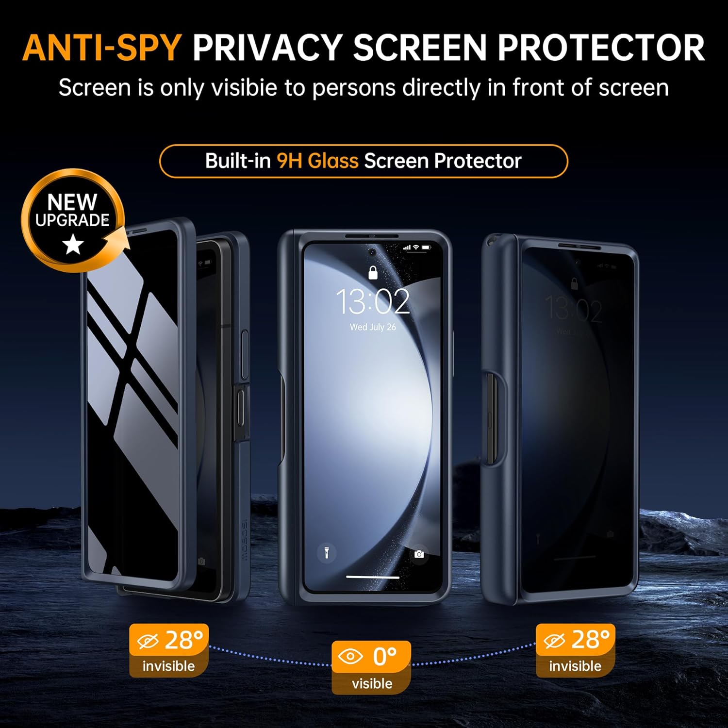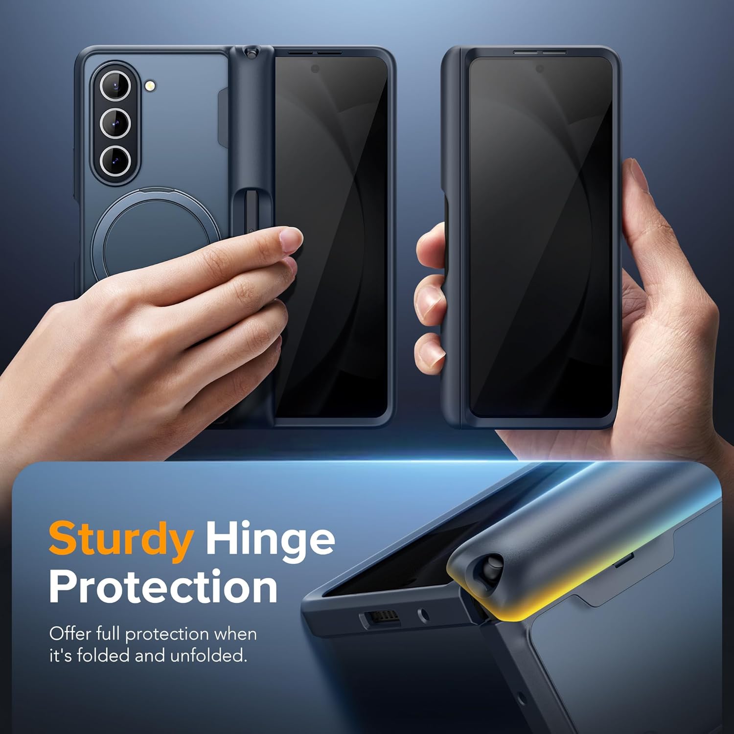 Protect your Z Fold 5 with ultimate style and functionality. This slim case features a 360° spin ring stand, Magsafe compatibility, built-in S Pen slot, and comprehensive screen and hinge protection. Sleek privacy black design meets robust defense.