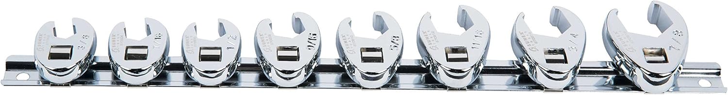 Professional-grade 8-piece crowfoot flare nut wrench set with 3/8″ drive. Sizes 3/8″-7/8″ feature fully polished chrome finish for durability. Perfect for tight spaces where standard wrenches won’t fit.