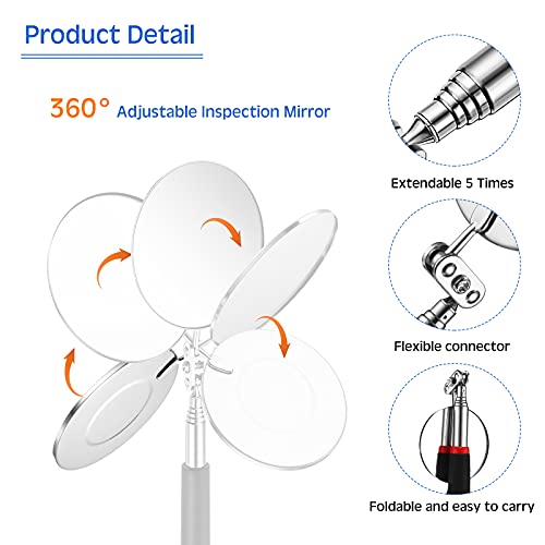 The Frienda Inspection Mirror features a telescoping handle that extends up to 22 inches, allowing you to reach areas that are otherwise inaccessible. The mirror itself is round and can be adjusted to various angles for a clear view of whatever you are inspecting. The LED light provides added visibility in dark or dimly lit spaces, making it an essential tool for any automotive enthusiast or mechanic.