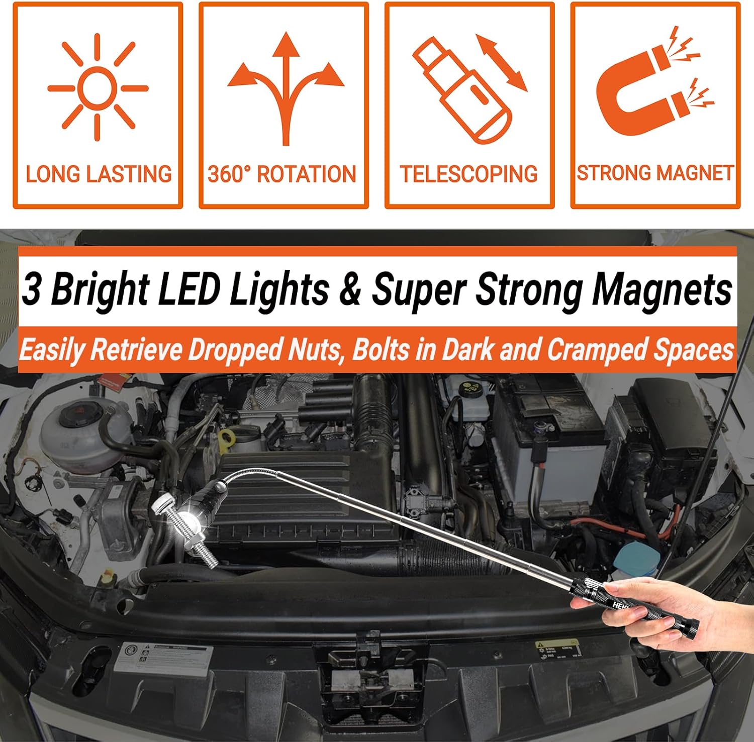 The magnetic head is genuinely impressive—during our testing, it easily lifted keys, screws, and even heavier items like wrenches weighing up to 5 pounds. We deliberately dropped small metal objects in tight spaces between appliances and under the car, and the telescoping magnetic pickup tool retrieved them effortlessly.