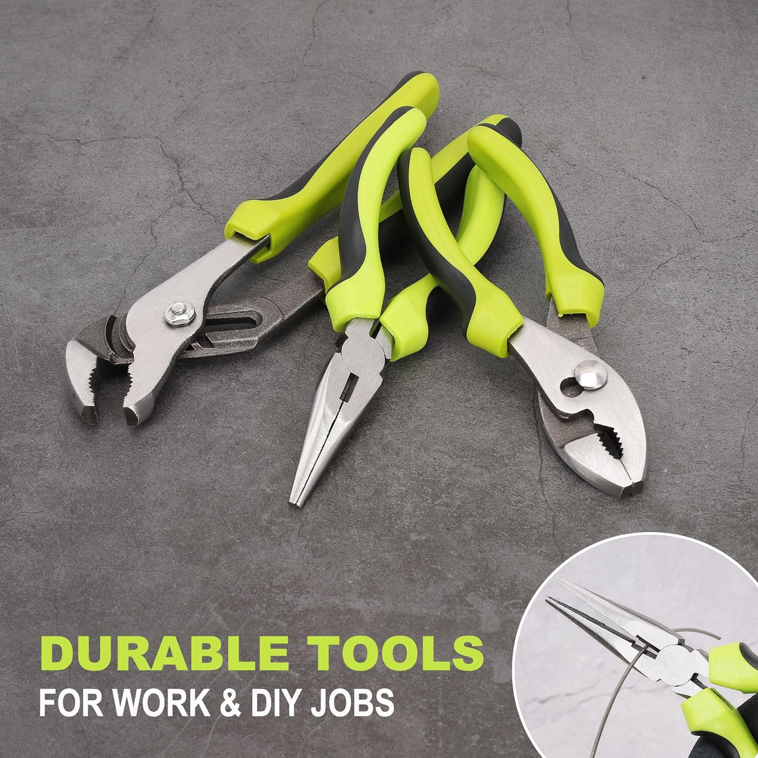 - Comprehensive Tool Kit: The set contains a plethora of tools, including slip joint and groove joint pliers, an adjustable wrench, a magnetic screwdriver holder, various screwdriver bits, and a tape measure.