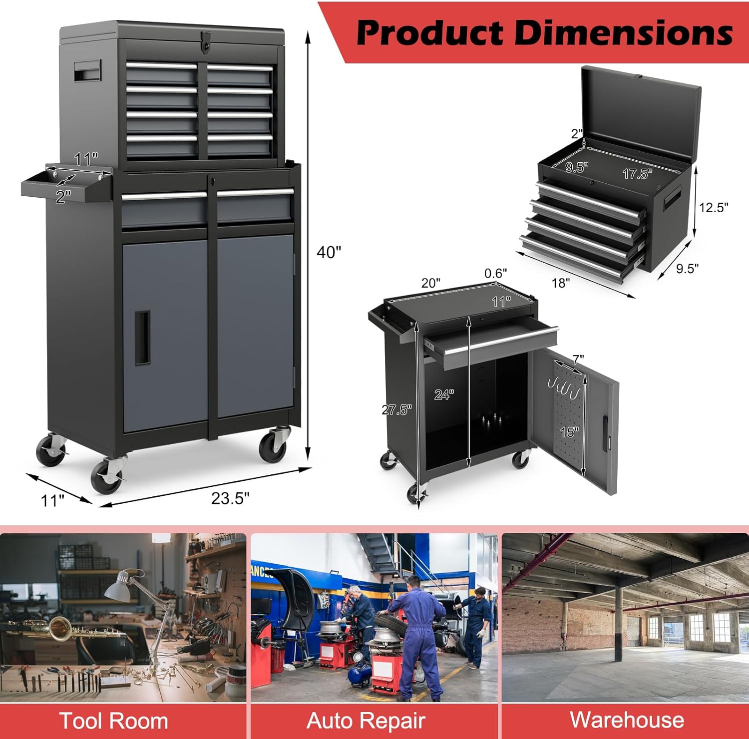 The Goplus tool chest features a sleek, modern design aimed at offering both functionality and space efficiency. It boasts five smooth-rolling drawers and a detachable top toolbox, allowing for easy organization of various tools and supplies. Its overall dimensions are 23.5” x 11” x 40”, small enough for home use but roomy enough for essential tools and accessories.