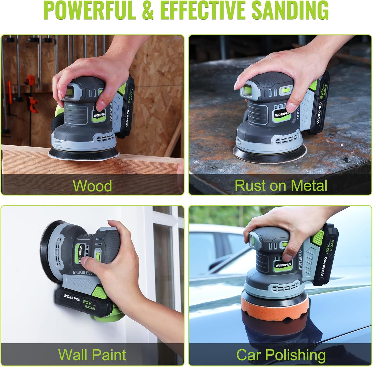 What sets the WORKPRO Cordless Random Orbital Sander apart is its intelligent design. The brushless motor ensures:
